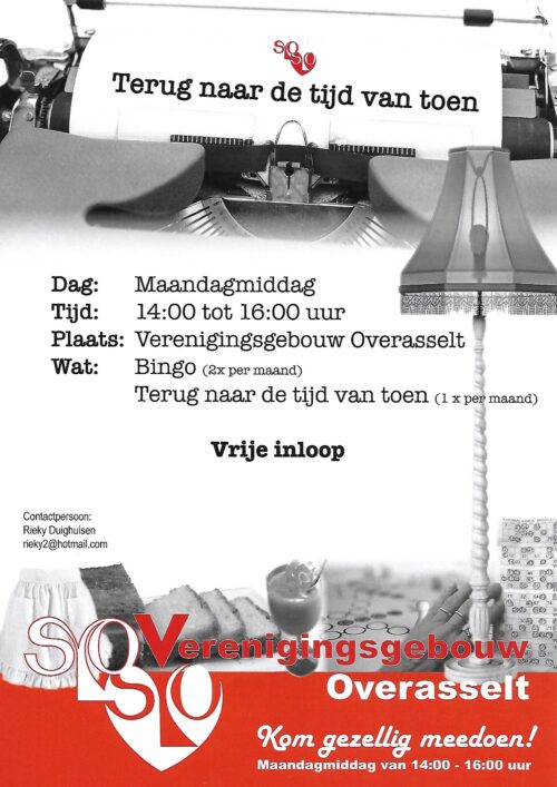Graag wil ik jullie informeren over een nieuw activiteit genaamd “Terug naar de tijd van toen” in combinatie met twee keer een Bingo. Het doel van deze activiteit is om mensen bij elkaar te brengen, eenzaamheid tegen te gaan en samen te verbinden. We streven naar een laagdrempelige en open cultuur, zodat iedereen welkom is om mee te doen en zijn of haar verhaal te delen. De activiteit wordt gesteund door de huisartsen en medewerkers van het verengingsgebouw, omdat we samen oog hebben voor gezondheid en welzijn.